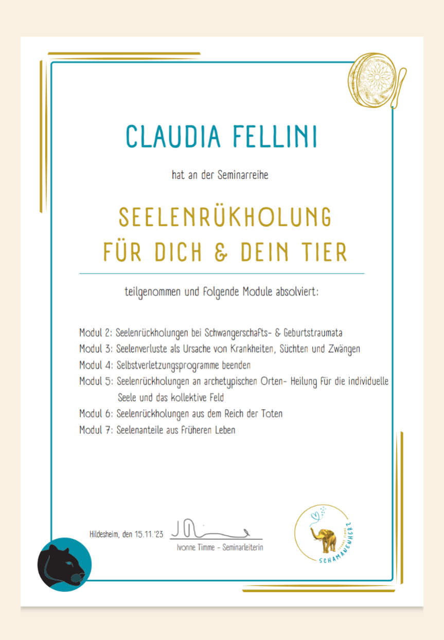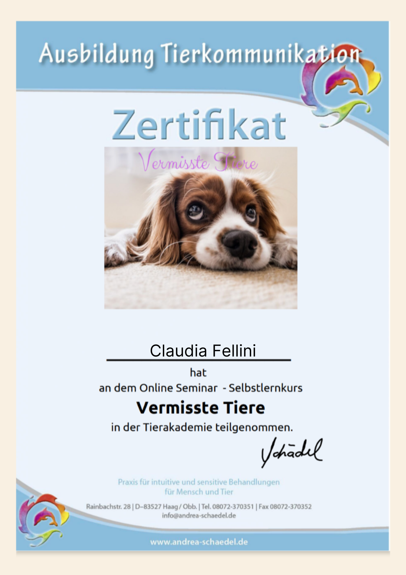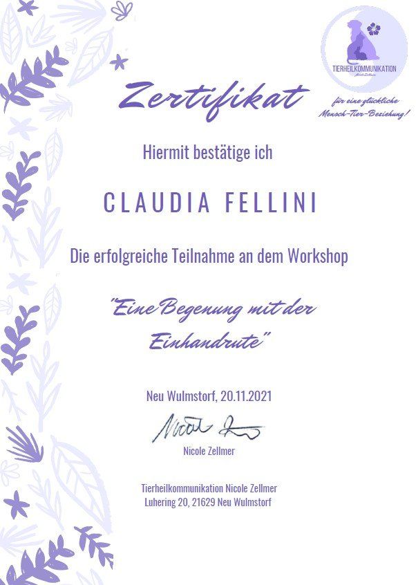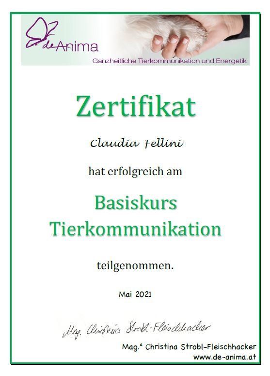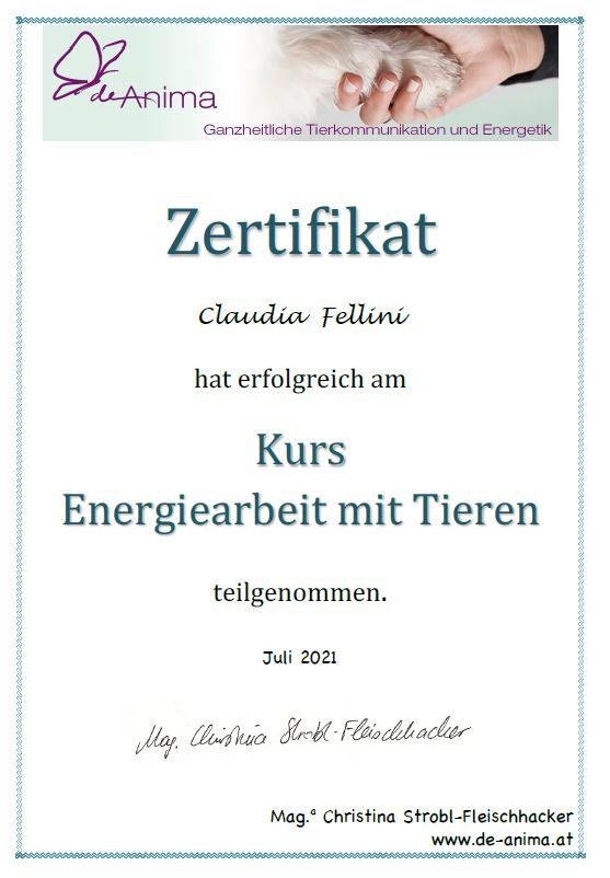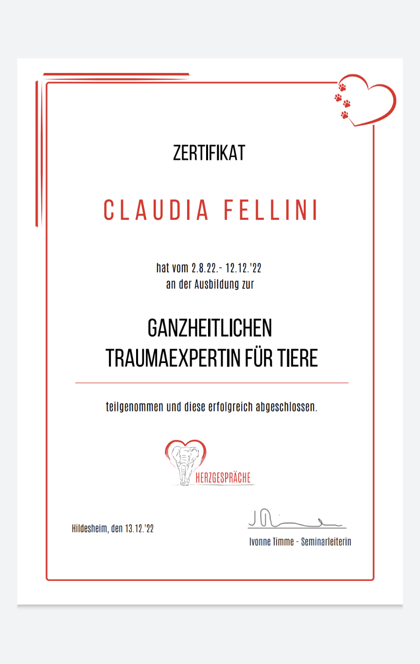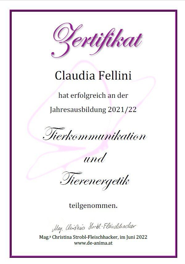 Ich bin Claudia Fellini und lebe meine Berufung. Meine Zeit und meine Liebe gehören den Tieren und ich bin sehr dankbar, dass ich meinen Seelenweg und meine Herzensaufgabe gefunden habe.