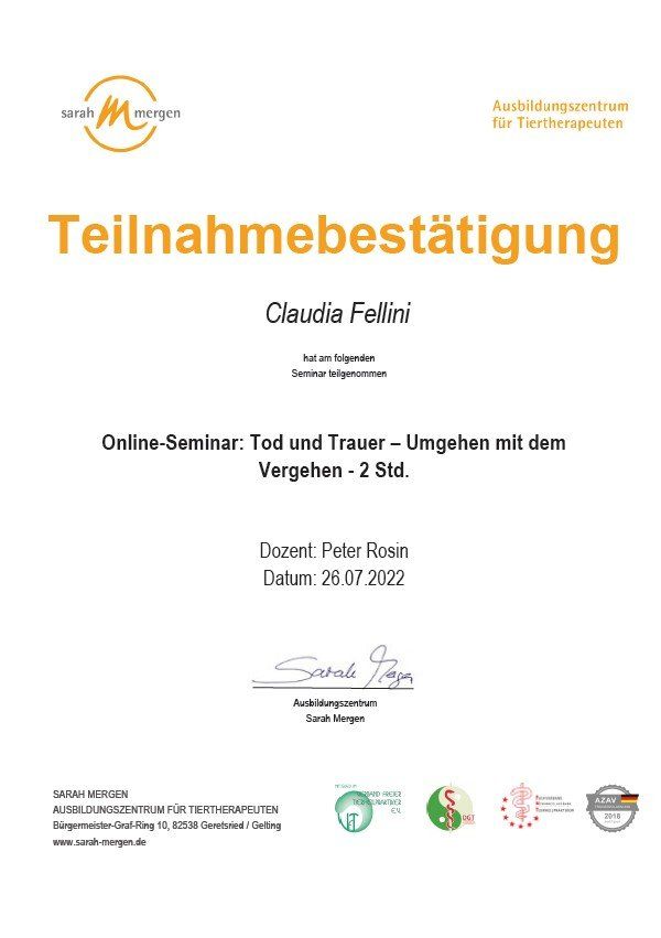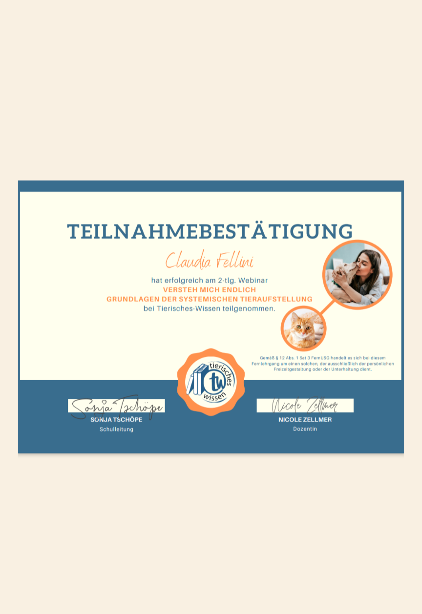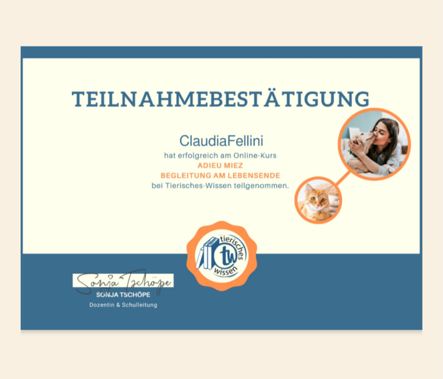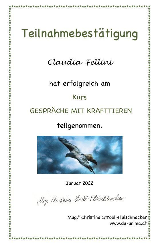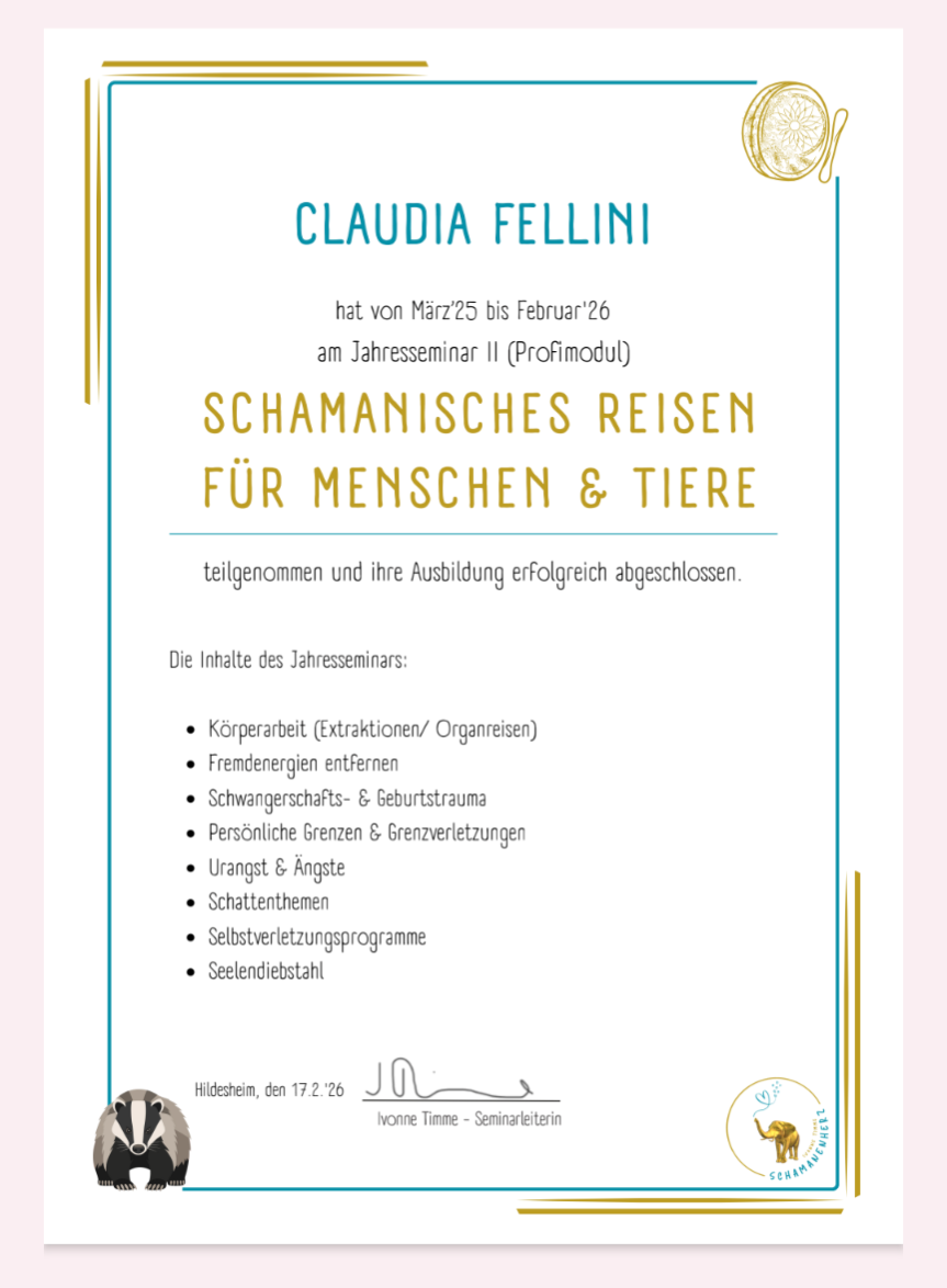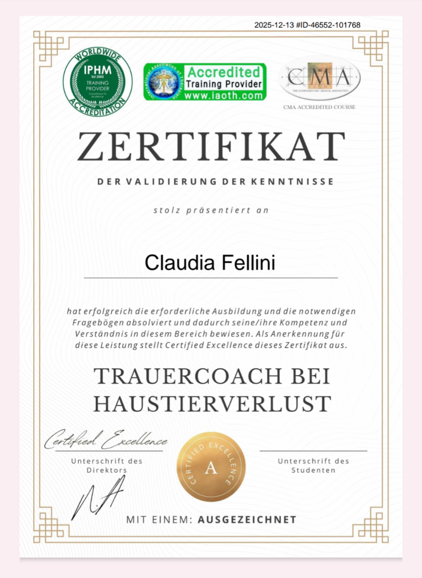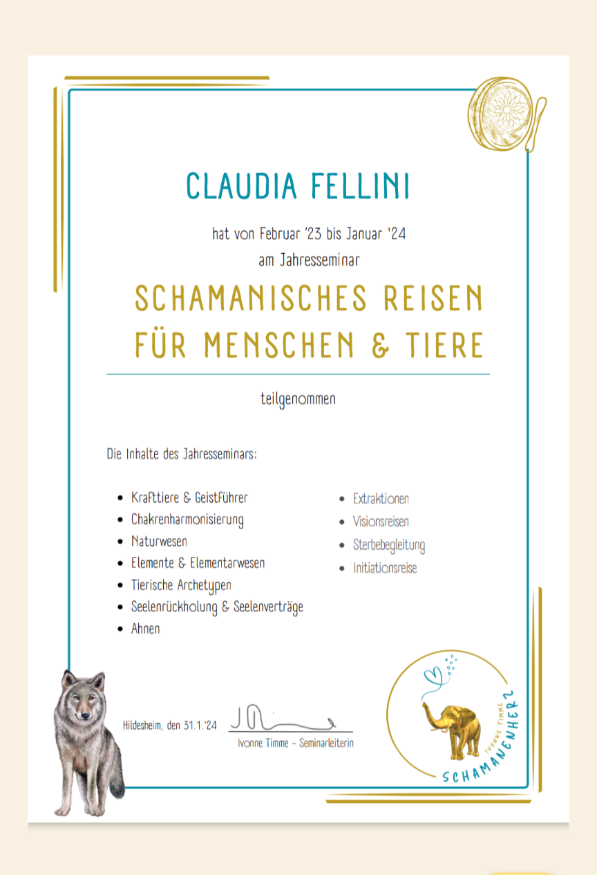 Ich bin Claudia Fellini und lebe meine Berufung. Meine Zeit und meine Liebe gehören den Tieren und ich bin sehr dankbar, dass ich meinen Seelenweg und meine Herzensaufgabe gefunden habe.
